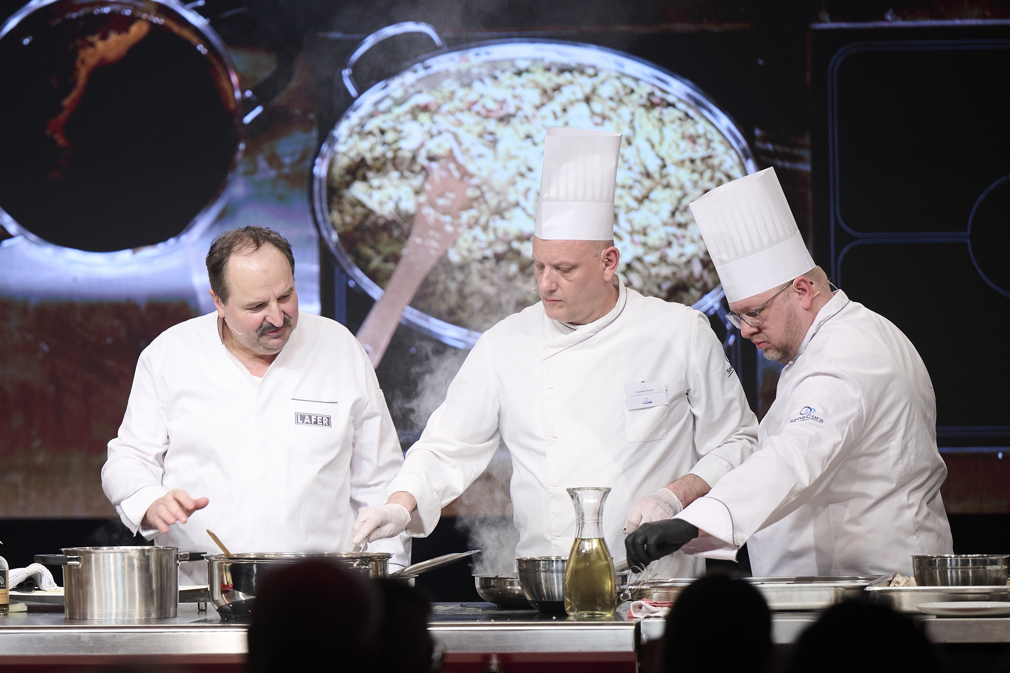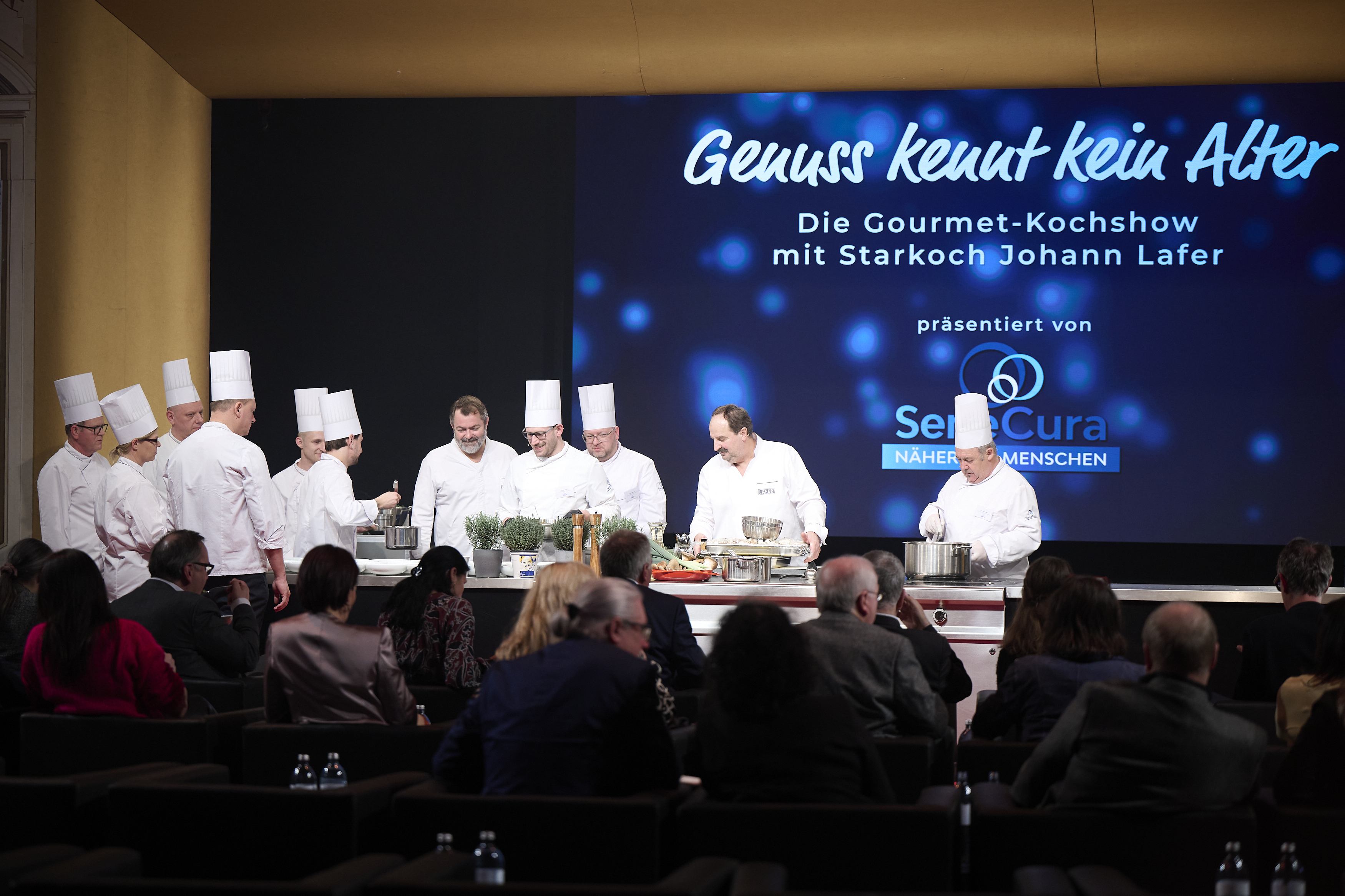 Die SeneCura Gruppe lud daher 50 Gäste – unter anderem Bewohner:innen naheliegender SeneCura Häuser – in die Wiener Interspot-Studios, um die Koch-Show zu genießen, viel Neues über gesunde Ernährung und professionelle Zubereitung frischer Lebensmittel zu lernen und natürlich auch das ein oder andere, seniorengerechte Häppchen zu verkosten. Johann Lafer ließ hier mit viel Herz sein umfassendes Wissen rund um ‚Medical Cuisine‘ einfließen und kreierte gemeinsam mit neun SeneCura Küchenchef:innen aus ganz Österreich kulinarische Highlights, speziell auf den Bedarf von älteren Menschen abgestimmt.
