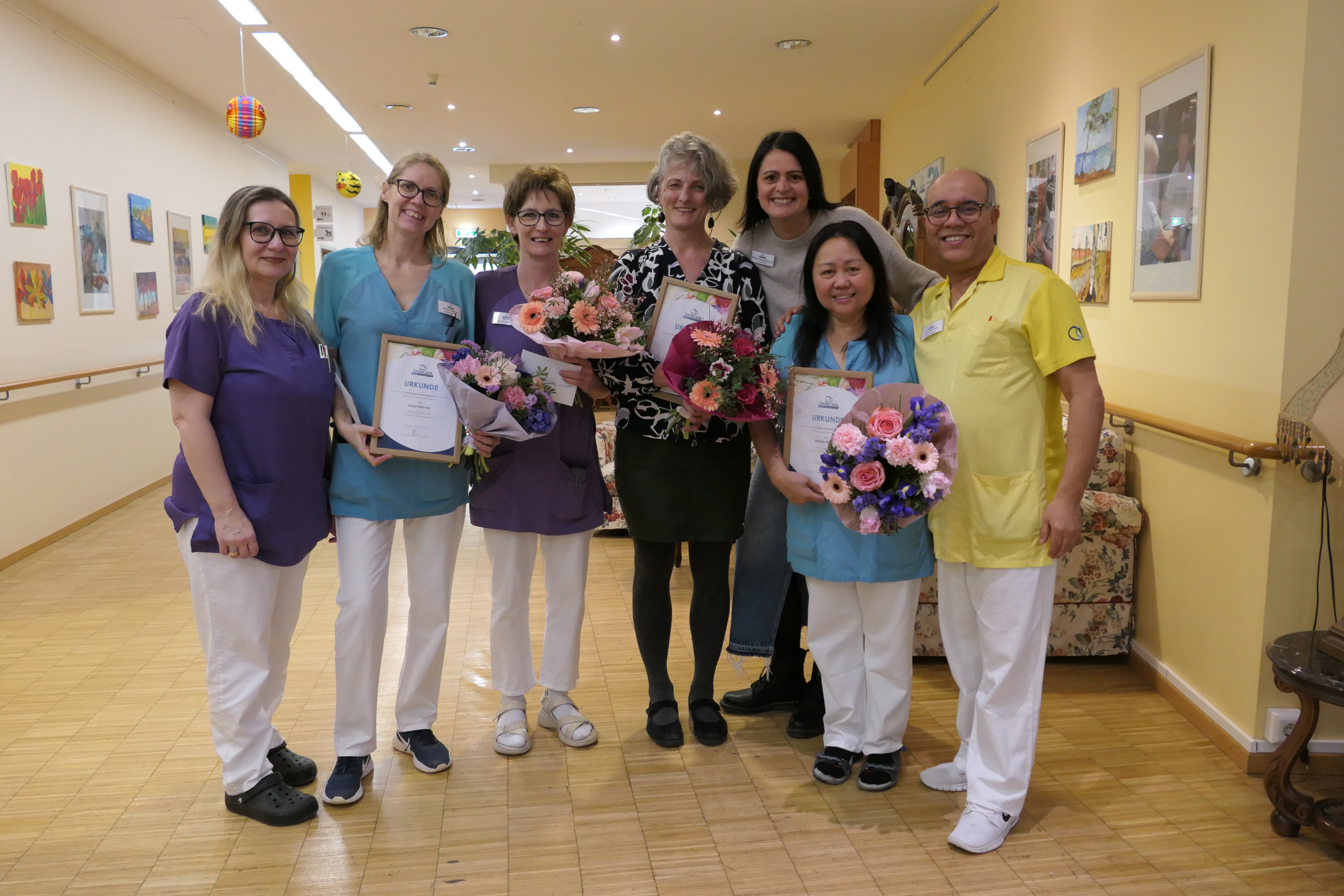 Heute wurden sie vor den Vorhang geholt: Wohnbereichsleiterin Sanja Holovka, Abteilungsleiterin für die Reinigung Maria Lindenbauer, Pflegeassistentin Ursula Erslan-Wisamering (war leider verhindert) und Direktionsassistentin Maria Zauner.