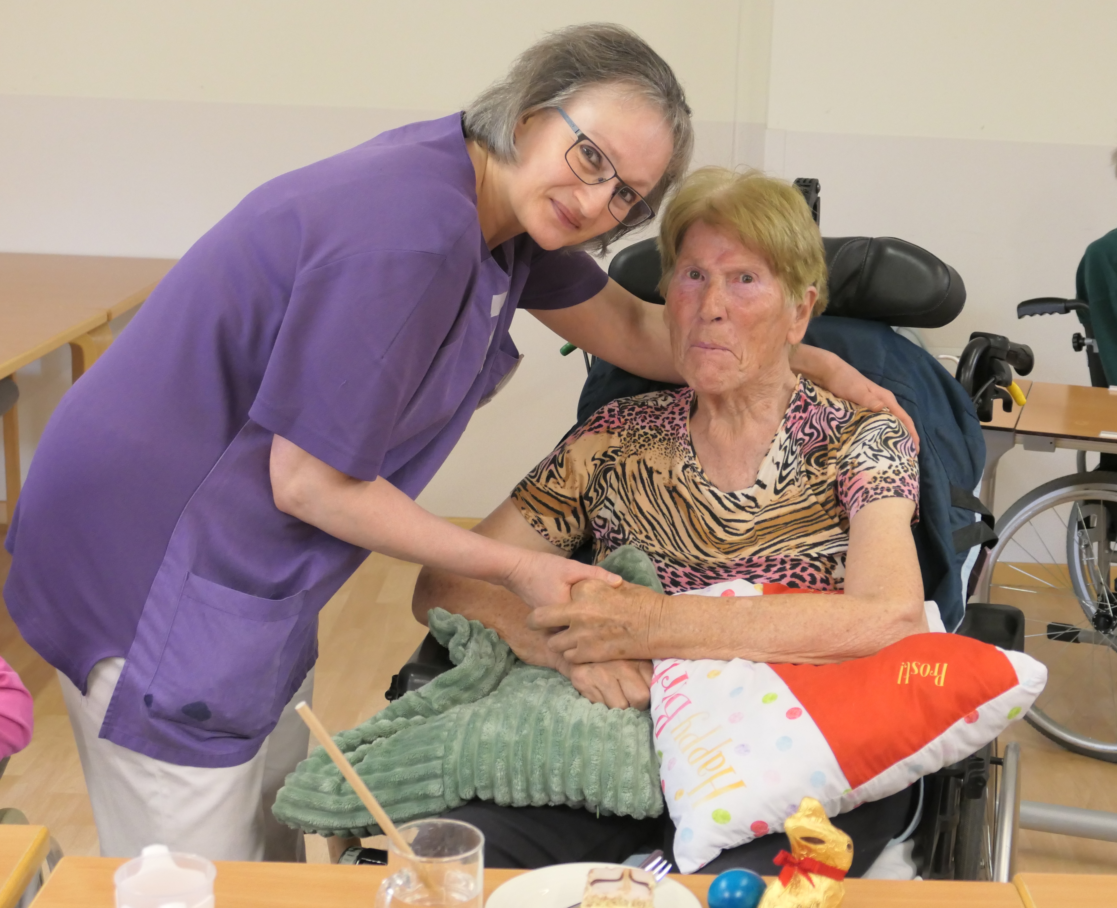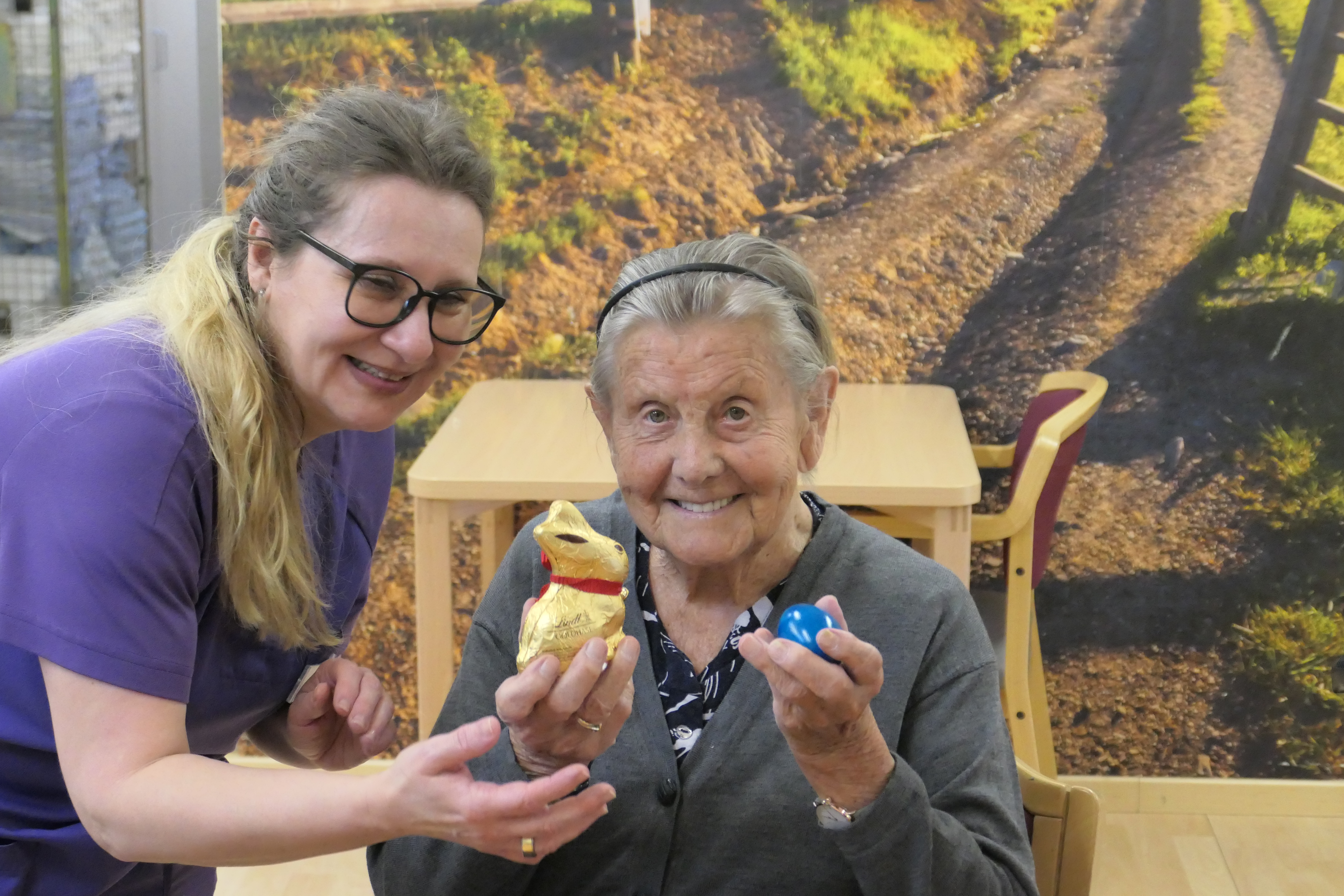Kürzlich zog der Osterhase durch das SeneCura Sozialzentrum Purkersdorf und ließ die Augen der Bewohner:innen strahlen. Die Pflegedienstleitung, Maria Zitarevic, und ihre Mitarbeiterinnen, Pflegeassistentin Urlsula Erslan-Wisamering und Heimhelferin Laura Kozokar, verteilen Schokohasen und bunte Ostereier im Haus.