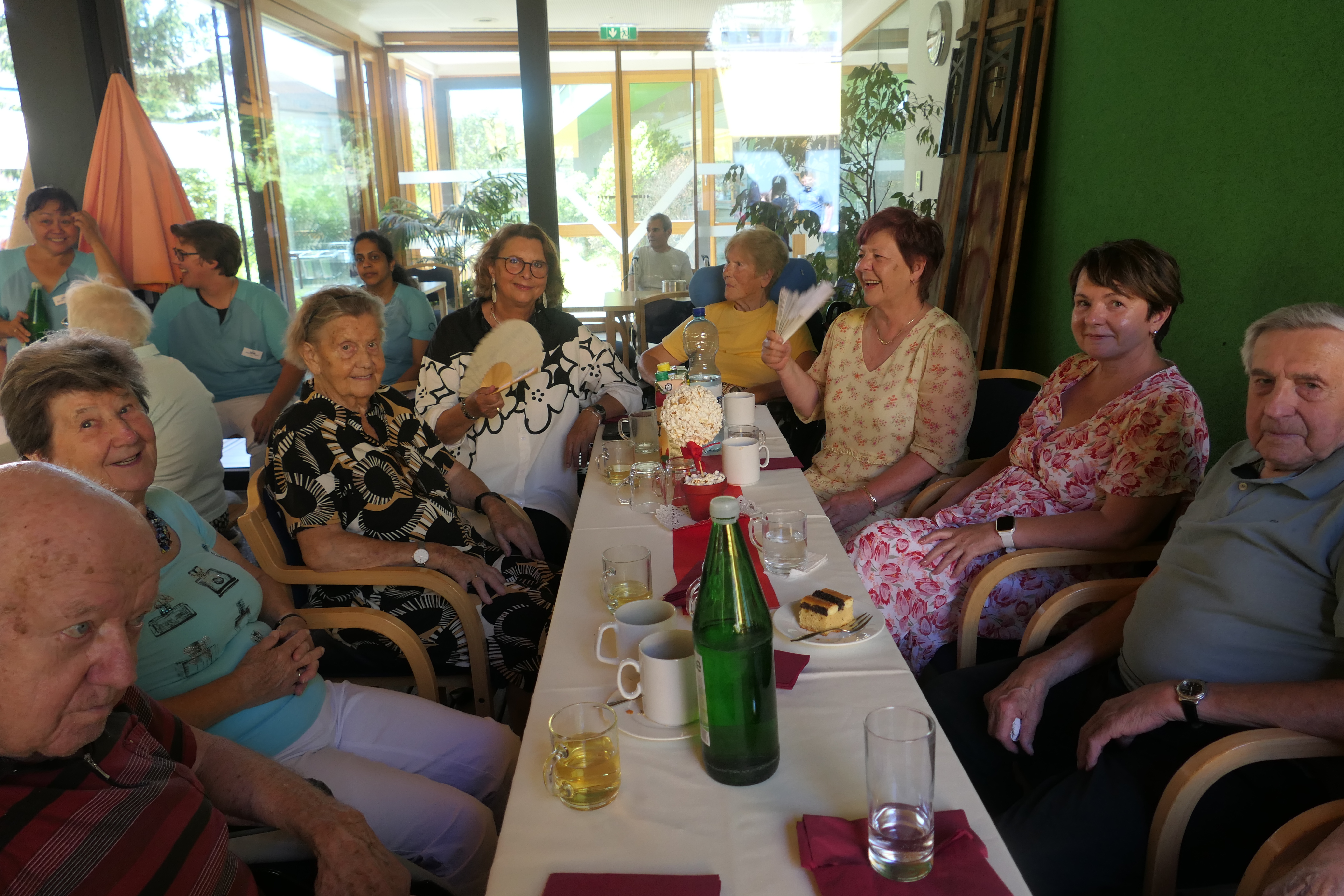 Gute Stimmung bei Bewohner:innen und Angehörigen beim Sommerfest bei heißen Temperaturen