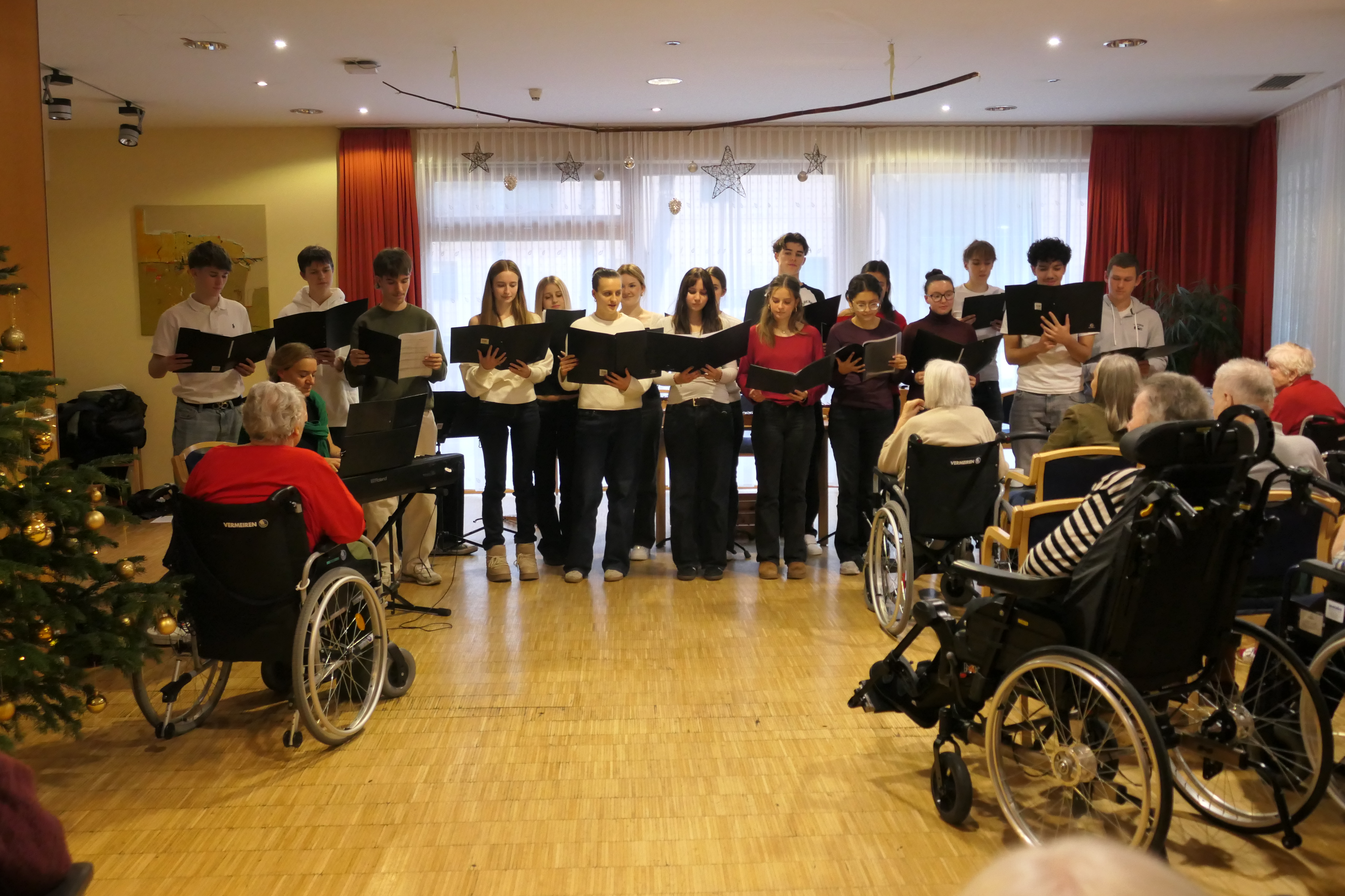Begleitet wurden sie von den Kindern der Volksschule Purkersdorf, die wunderschöne Weihnachtslieder sangen und so eine wahrhaft stimmungsvolle Atmosphäre ins Haus brachten. Wir durften auch wieder die Schüler:innen des Gymnasiums Purkersdorf begrüßen, die gemeinsam mit ihrer Professorin, Mag. Dagmar Furch, weihnachtliche Texte vortrugen, musizierten sowie sangen und uns so Weihnachten wieder ein Stückchen näher brachten. Unsere Bewohner:innen summten auch gerne das eine oder andere Lied mit und erinnerten sich so an frühere Weihnachtsfeste.
